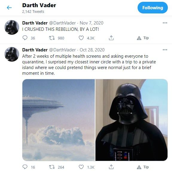 It is not affiliated with the Star Wars productions. Darth Vader is also another funny Twitter account that tweets about things about Star Wars habitus. Nevertheless, it is a parody account; it presents smart, hilarious memes, news, funny discoveries, etc.