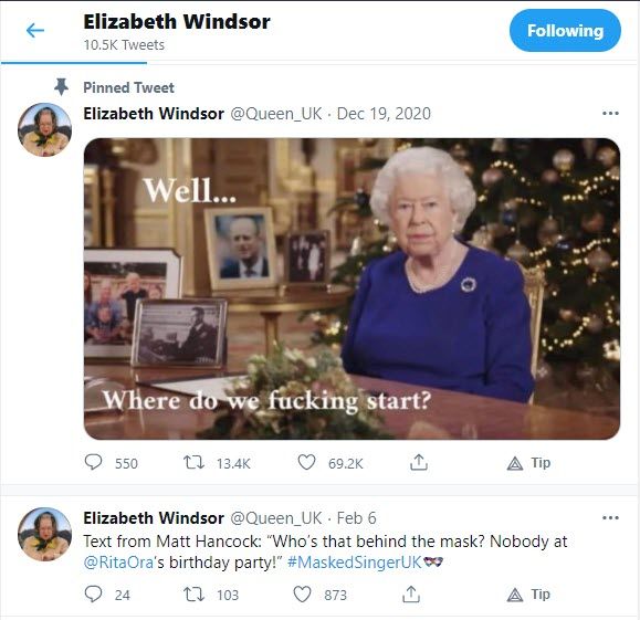 It is a parody Twitter account of Queen Elizabeth herself. It is one of the funny Twitter accounts you can find. If you are interested in politics a bit and enjoying political jokes, this funny Twitter account is definitely for you!
