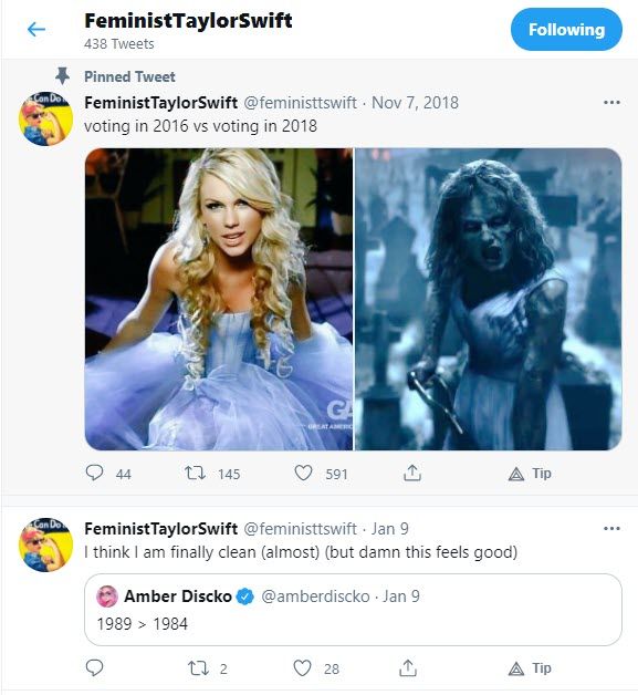 Feminist Taylor Swift is an absolutely fantastic funny Twitter account. She takes lines from the famous singer Taylor Swift and throws them in some feminist perspective. This Twitter account really worth to be followed in 2026!