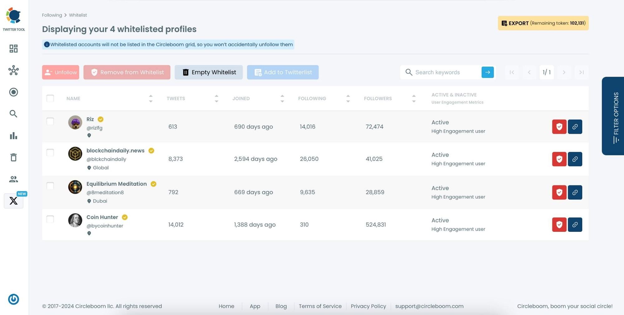 If you have favorite accounts—like celebrities, brands, or industry leaders—that you never want to unfollow, Circleboom’s whitelist feature is here to help. Simply add these accounts to your whitelist, and they won’t show up in your search results when you’re cleaning up your following list. This feature prevents accidental unfollowing of important accounts.