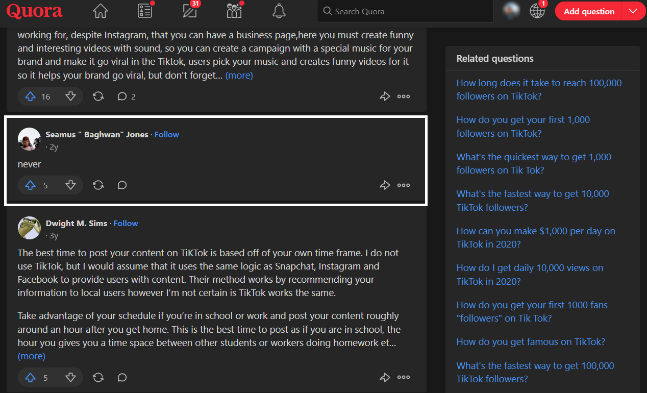 You have to create related, authentic, and attractive content and also develop other strategies to be successful on TikTok. Otherwise, your best time to post on TikTok will be 'never' as Seamus Baghwan Jones said in an open discussion on Quora.