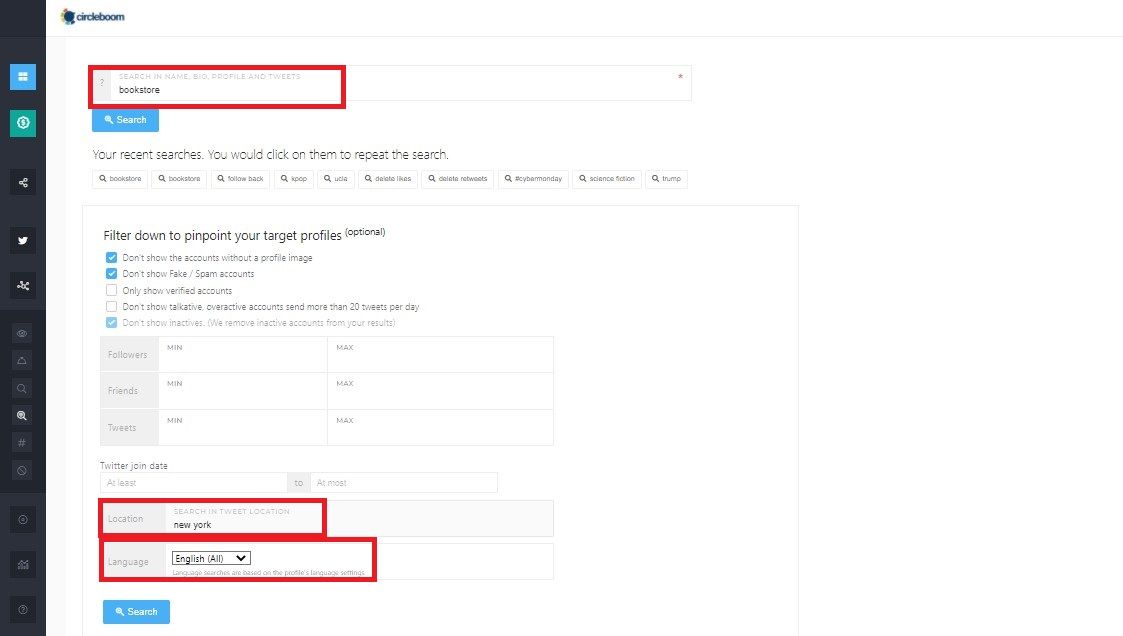 Via Circleboom's Smart Search, you can search users' bios, tweets for geo-targeted keywords.