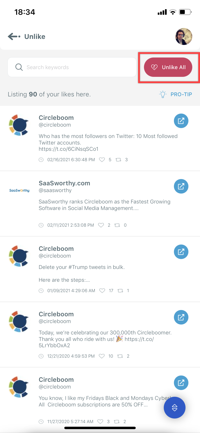 Moreover, you can consider using "Keyword Search" bar to find out some specific tweets to unlike. Or if you don't want to bother yourself with sorting your Twitter likes and just would like to delete all Twitter likes at once, you can just go and tap the red "Unlike All" button upper right.