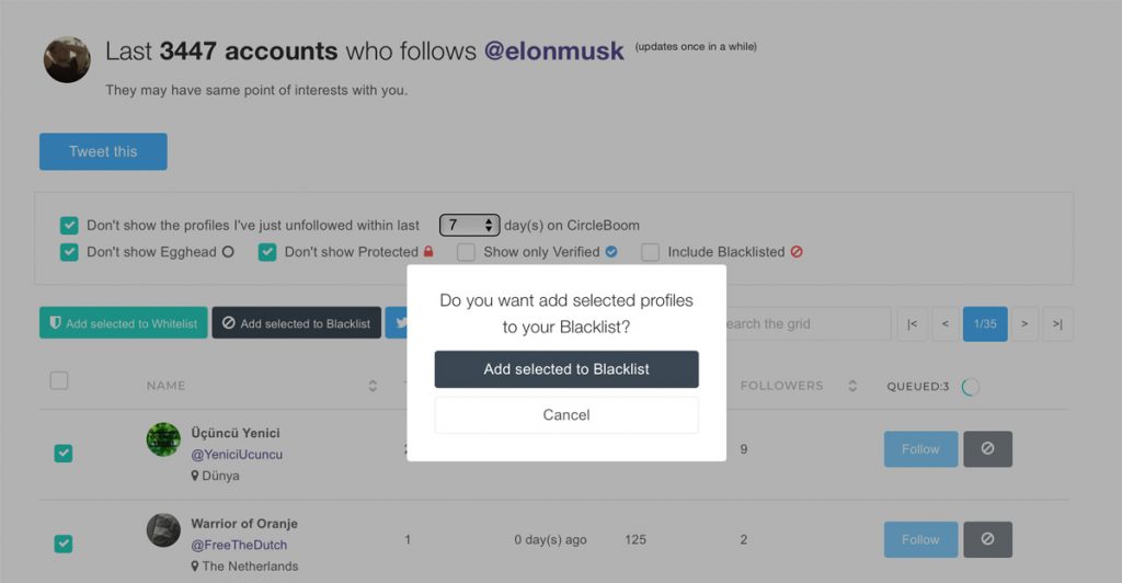 It almost works as same as the Whitelist which protects your friends from accidental unfollows during fast-clicks but protects you to follow unwanted profiles accidentally. By default, we exclude the blacklist results from the searches unless you say so. Just click on the profile checkboxes on the grid, and click on to the “Black button” with the text “Add selected to Blacklist.”