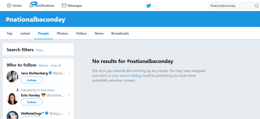 If you type #nationalbaconday on Twitter, you will get all the tweets and you would have to specifically look for accounts and follow them. If you search for people on Twitter, you get 0 results.