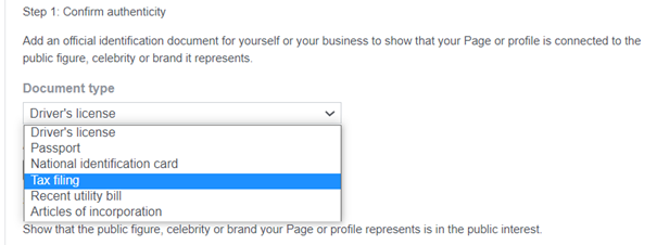 Following your selection, Facebook will require you additional documents as listed in the drop-down menu.