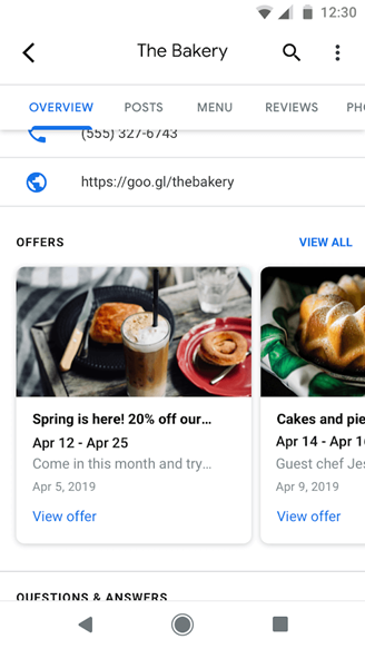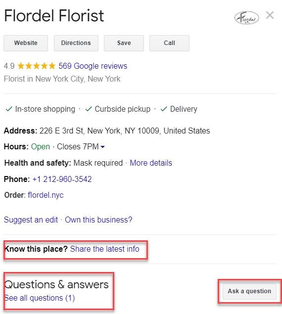 Here customers can ask questions to be answered or create user-generated answers that Google asks to fill common questions such as "is there parking available."