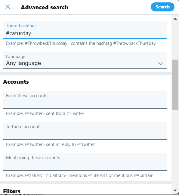 If you’re interested in navigating deep in specific hashtags, then you can use Twitter’s advanced search to do so. The advanced search has a good set of filters that help you quickly browse through what’s important.