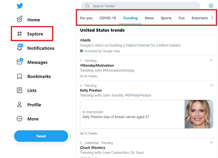 - If you want to see what’s trending in specific segments like news, sports, fun, entertainments, then you can click on respective tabs to learn about them.