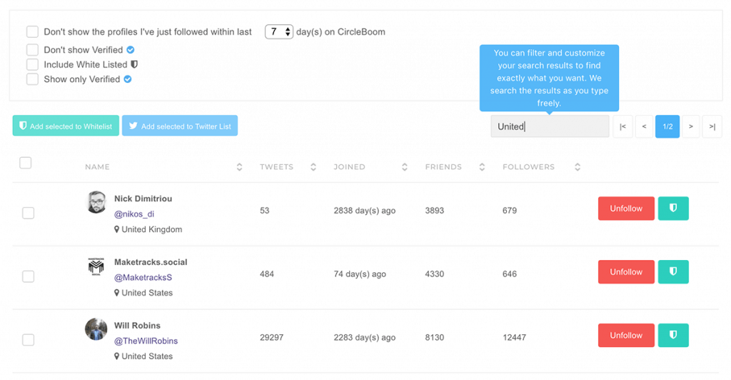 Step 4: While following accounts from the Circleboom dashboard, you can also use the grid power search to search for particular keywords real-time.