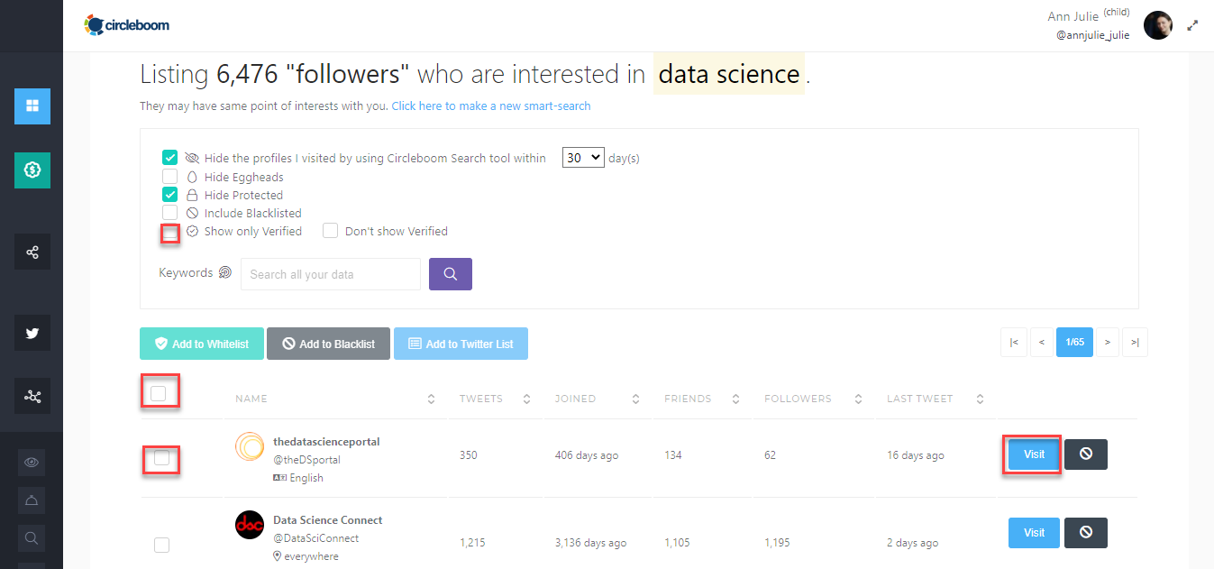 Via Smart Search, you can filter your search with many parameters like "Show only verified" feature of Circleboom. Once you select the checkbox next to it, only verified Twitter accounts will be listed.