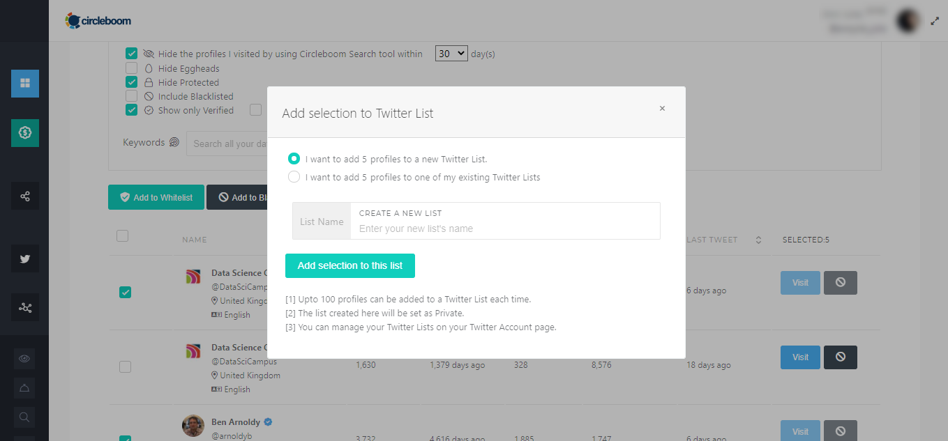 Step #4: Once you have found the accounts you want to follow without them knowing, click to checkbox next to them add or create a Twitter List.