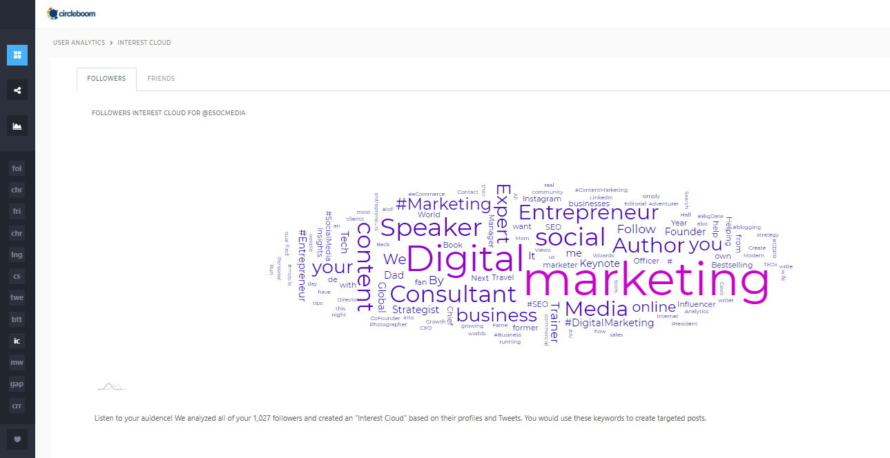 With Circleboom’s interest cloud, you will know the primary interests of your audience. This will help you in selecting which topics to primarily post on so your followers can connect well. The bigger the font of the topic, the more interested your audience is in it.
