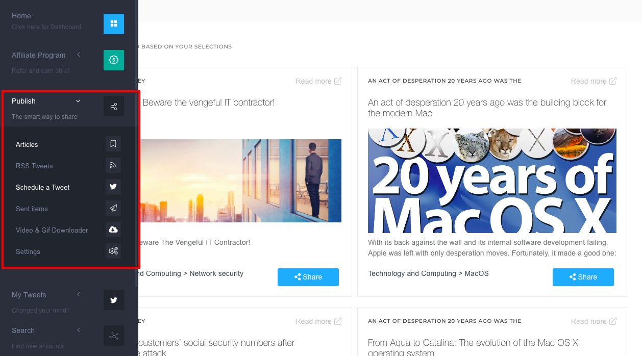 You can select your areas of interest from over more than 300 categories, and based on your selection, Circleboom's Publish Tool checks over 127,000 different RSS feed to provide you thousands of blogs and websites with related content. You can share these curated articles with only one click.