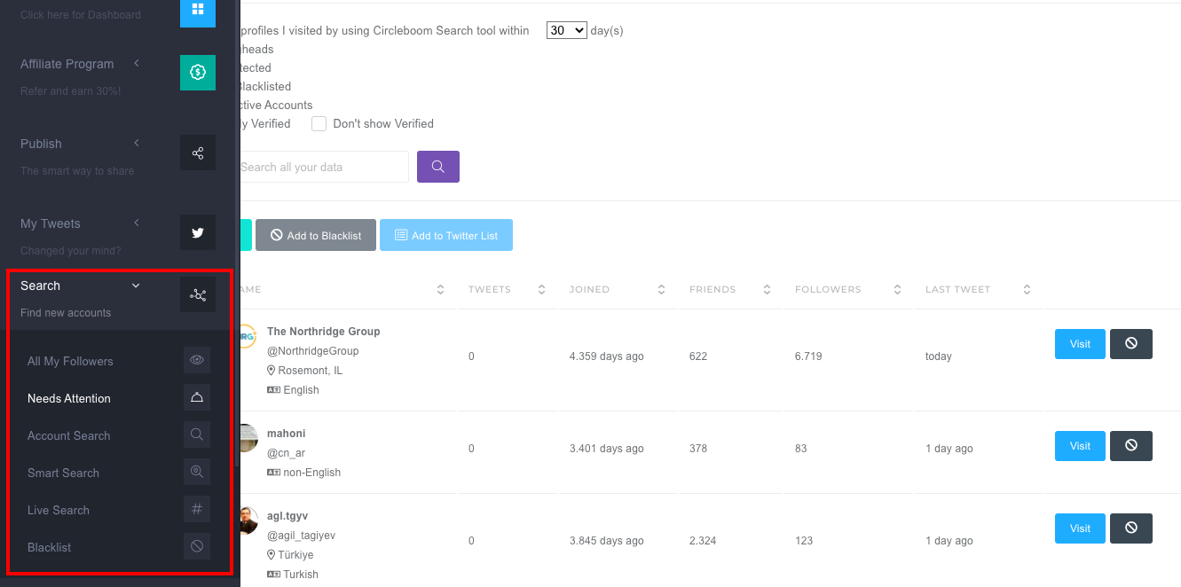 With Circleboom's Smart Search, you can easily find trending keywords and hashtags, find people with the same interests and reach your target audience by simply searching the keywords of that specific interest.