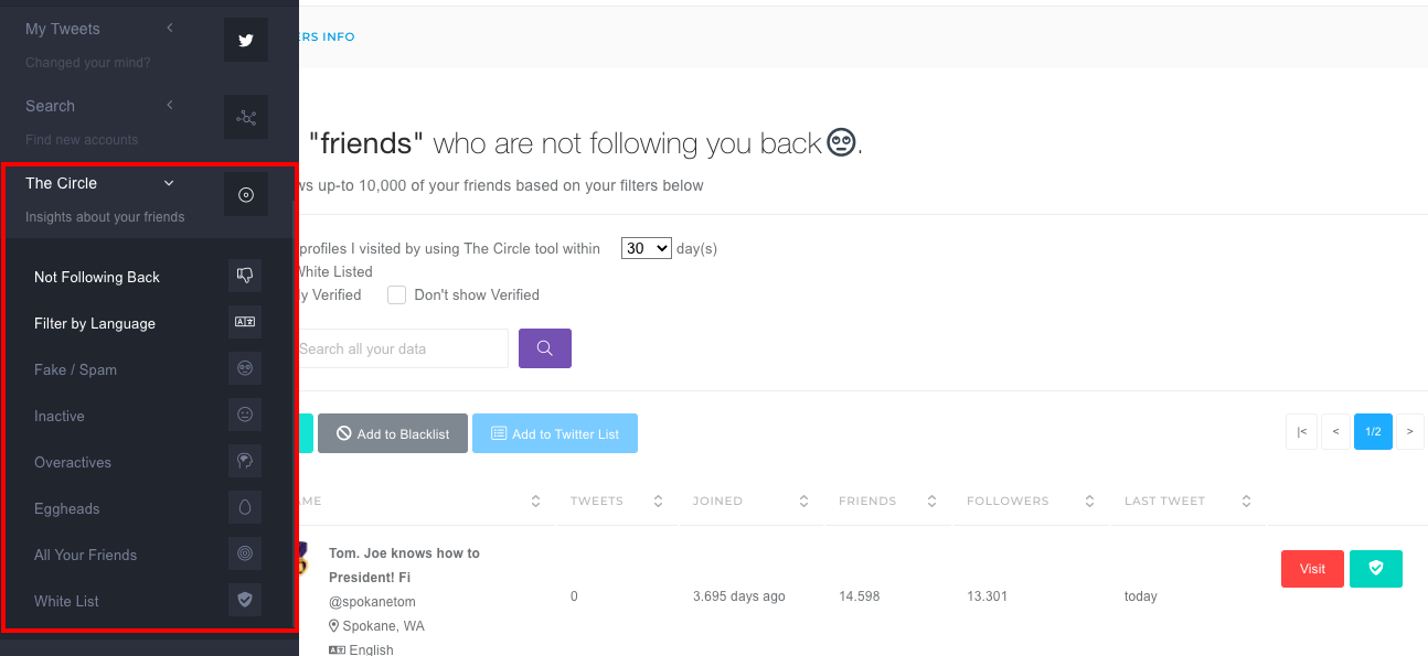 A good following/follower ratio will definitely help you to increase your Twitter followers. The Circle Tool will help you to identify your non-followers, inactive and overactive users, eggheads, fake and spam accounts in your list.