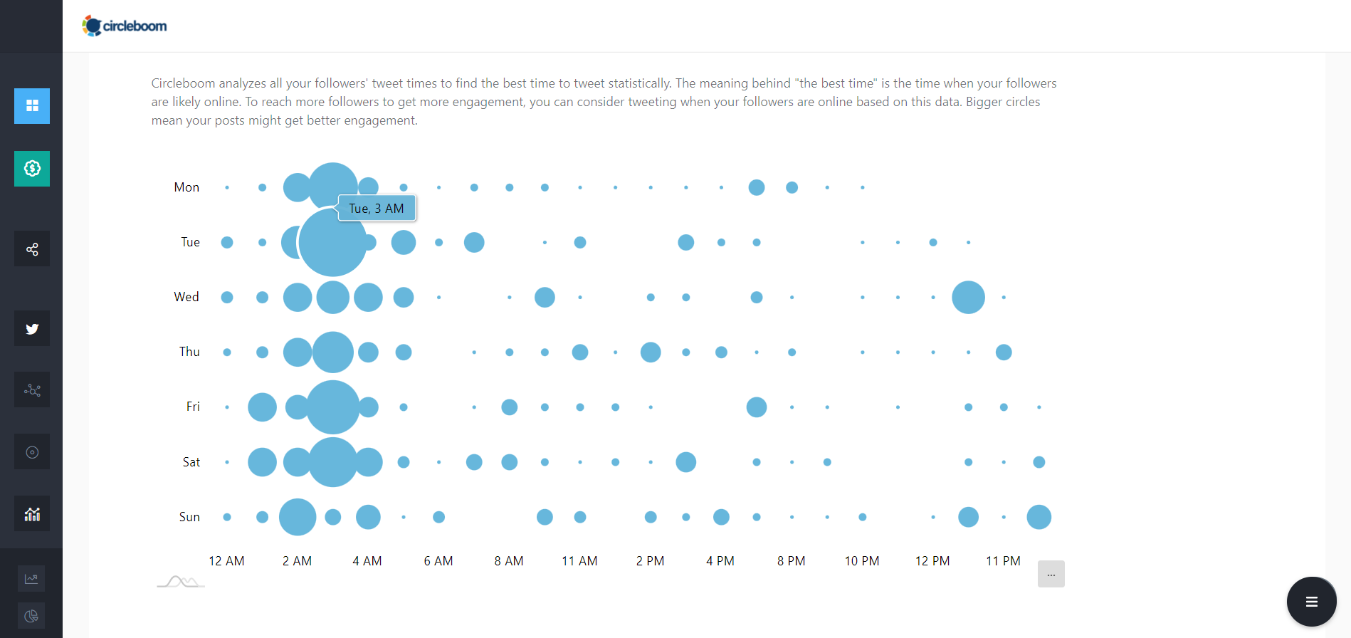 That is what exactly Circleboom Twitter does! It analyzes all activities of your Twitter audience and comes up with a nice-looking graph showing you the best time to tweet.