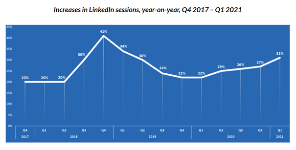 As the parent company, Microsoft reported, LinkedIn sessions rose 31% year over year in Q1 2021. Microsoft adds that engagement is at an all-time high but doesn’t elaborate.