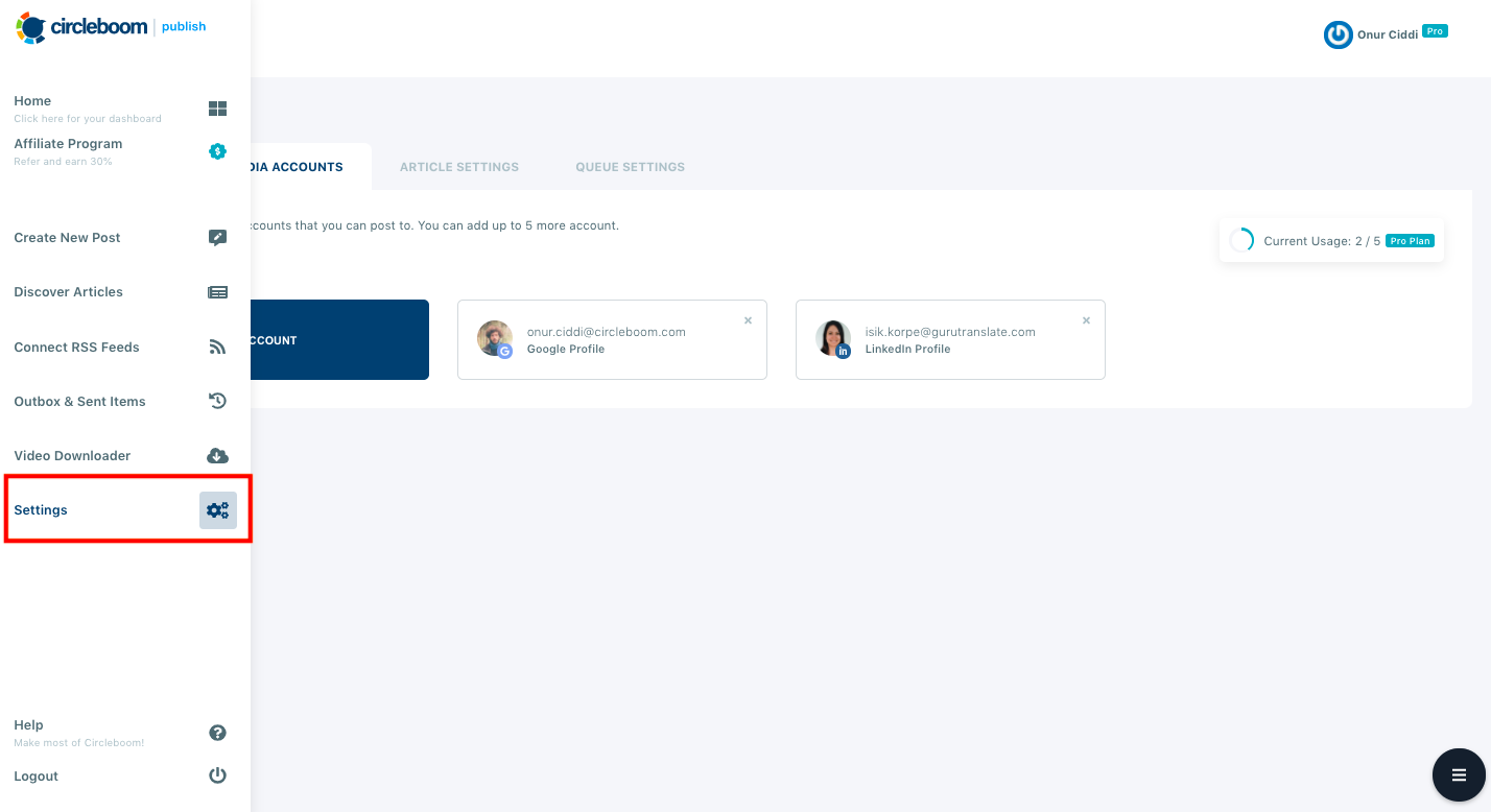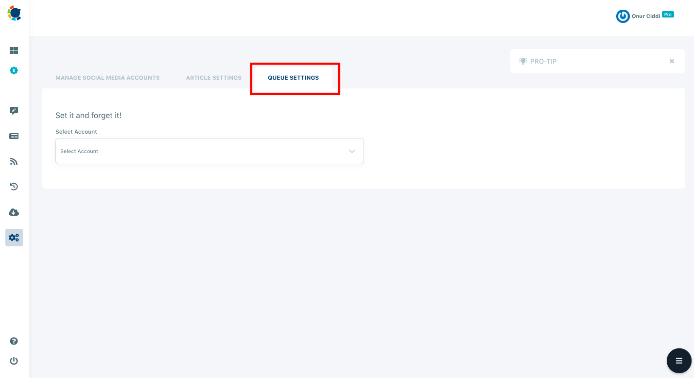 Find three sections in the Setting menu, named after “manage social media accounts,” “article settings,” and “queue settings.” Select queue settings here.