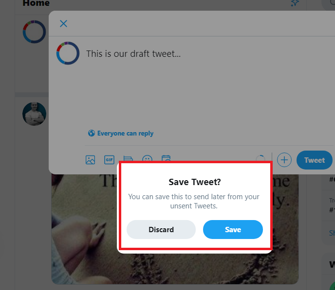 Step 2: Next, click on the cross at the top left. Twitter will ask you if you want to save your tweet to unsent tweets. Click on save and your tweet will be saved as draft.