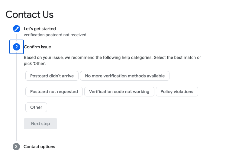 Step #1: Head to Google support and identify your business and problem. Choose the business you are having trouble verifying and specify your problem.