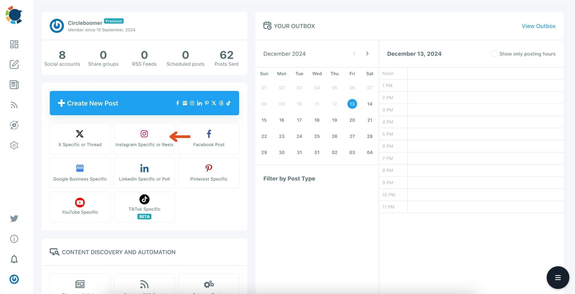 Step#2: On the dashboard, navigate to the left and click on Instagram Specific & Reels Post”.