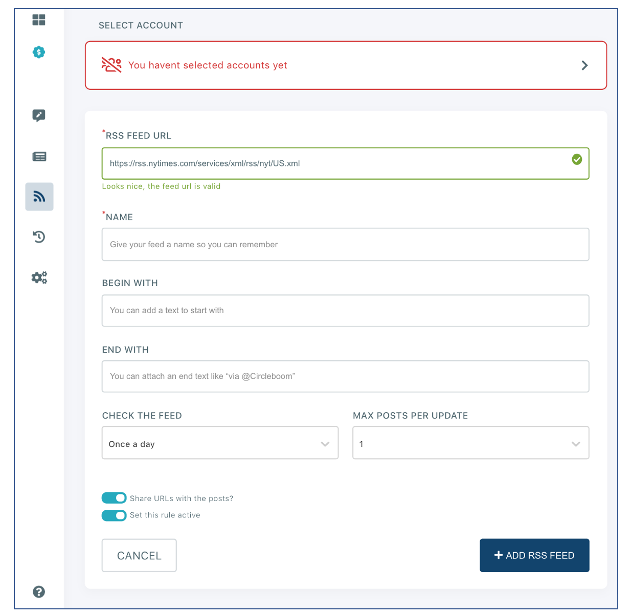 If you had some other RSS feeds connected to social accounts via Circleboom, it would also be shown in "List your connected feeds"