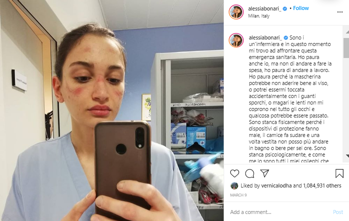 Alessia Bonari was a fashion influencer on Instagram before she went viral this week for her services as a nurse during the Coronavirus outbreak. She posted a picture with the marks that health workers get for wearing masks for a longer period of time. She also added a caption urging people to stay at home and for doing their part. Her caption clearly stated all the problems that health workers are going through to keep up with the process, thus getting a lot of shares and popularity on Instagram.