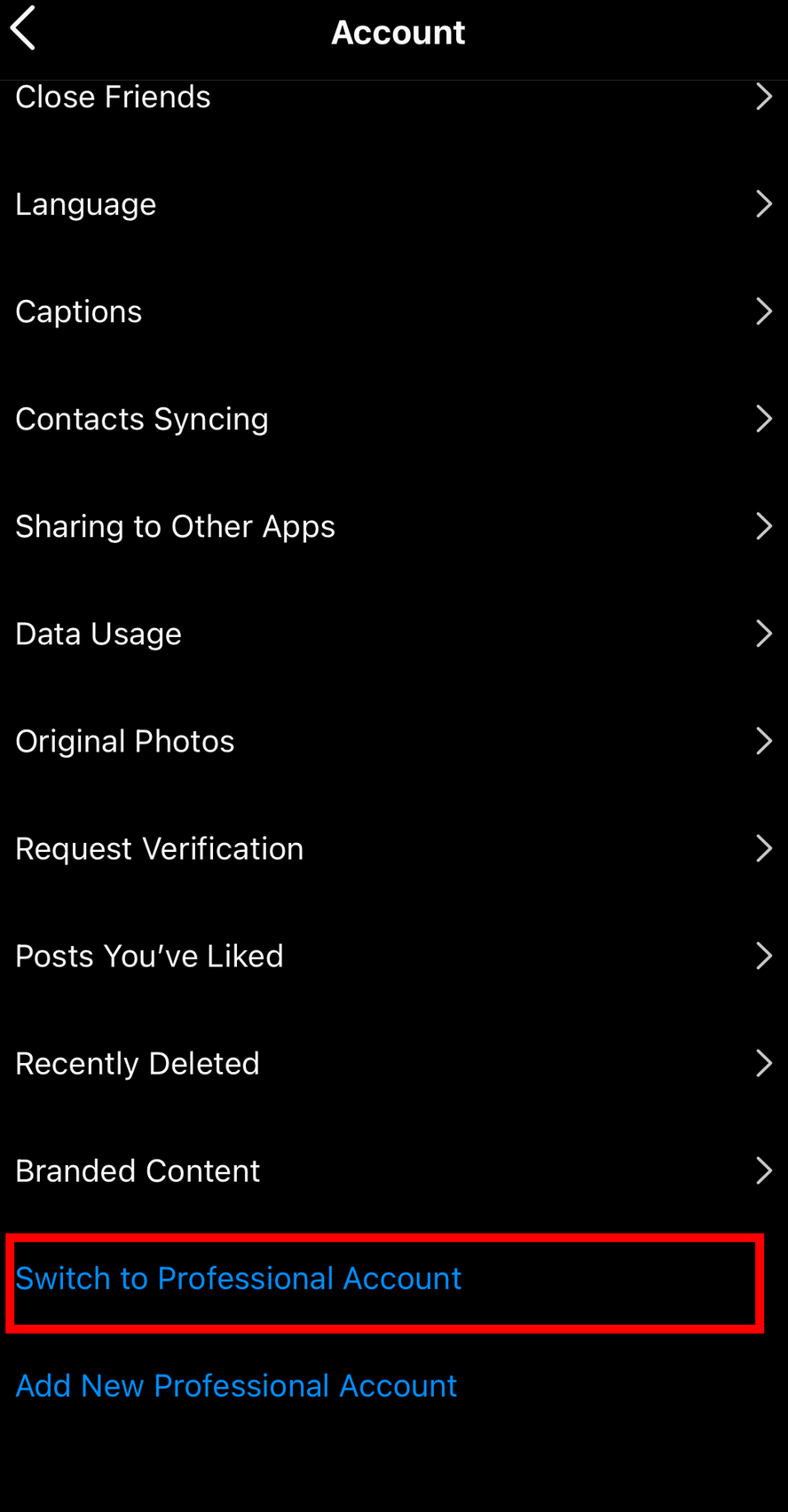 Step #3: Select the “Switch to Professional Account” option at the bottom of the menu.