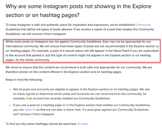 However, later on, Instagram stated that postings deemed “inappropriate for our international audience” would not be published on the Explore Page, even if they complied with Instagram’s Community Guidelines. It brings us to the app’s and its team’s final authority to decide on “inappropriate” content and take action about it.