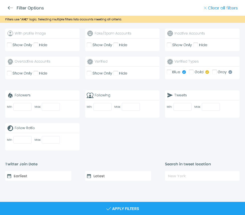 - On top of the initial filters for verified Twitter accounts, follower base, etc., you can also benefit from the Twitter advanced search filters of Circleboom to further increase your accuracy.