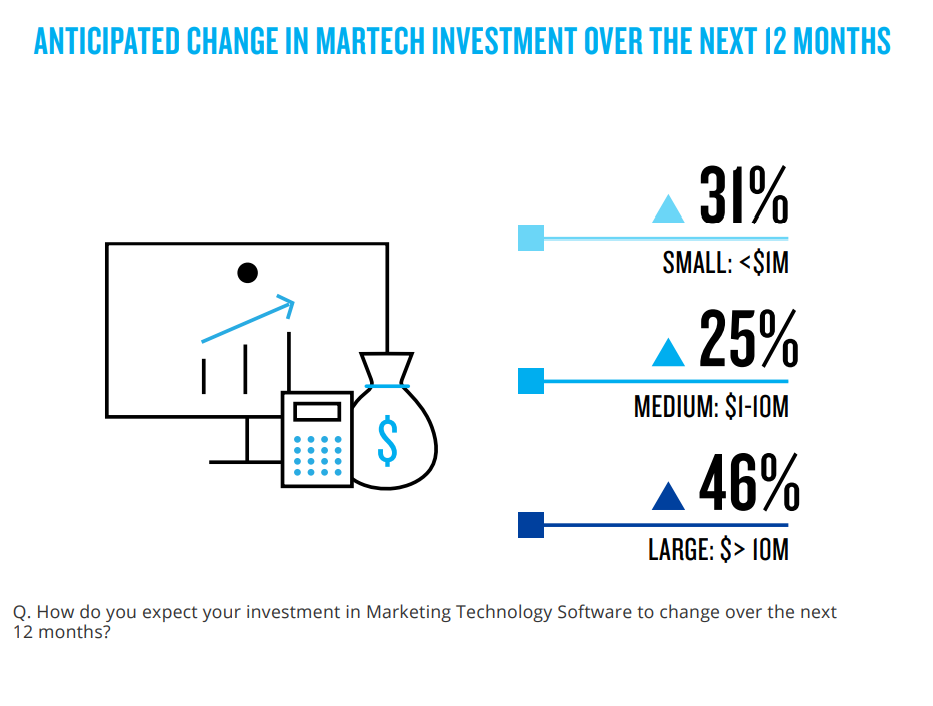 This confidence is also affected by the industry sector of the firm. Tech companies seem to do well in marketing-tech due to their adaptivity and eagerness over new technologies and solutions. The strange point is that retail companies are almost as confident as Tech companies.