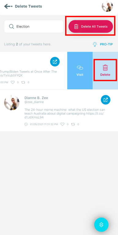 You can delete tweets in bulk by clicking the "Delete All Tweets" option next to the search bar. Or, you can delete tweets one by one by swiping left and clicking "Delete""