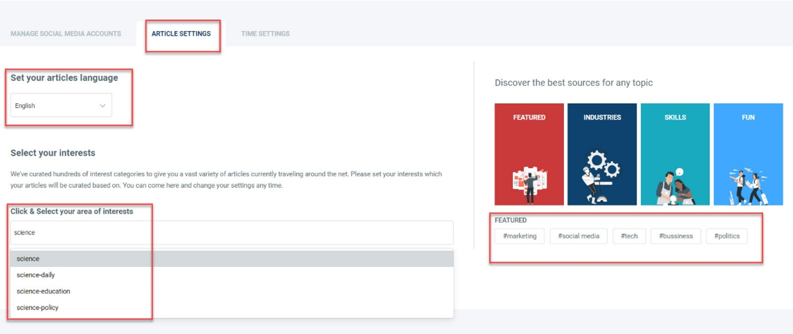 Circleboom Publish's article curation service offers over 200,000 articles from all over the internet! You can select the relevant topics and categories from the right-hand interest templates or type them into the search field.