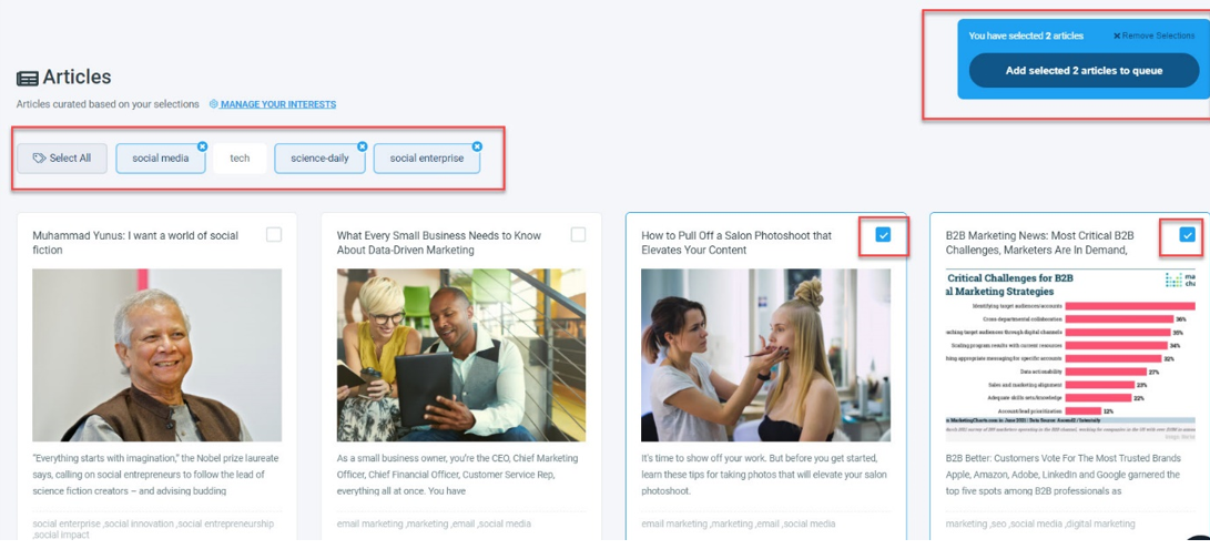 After choosing and saving your themes, you will be brought to Circleboom Publish's article curation page. You can browse the article timeline and choose articles to keep your LinkedIn pages updated!