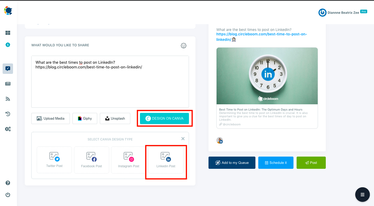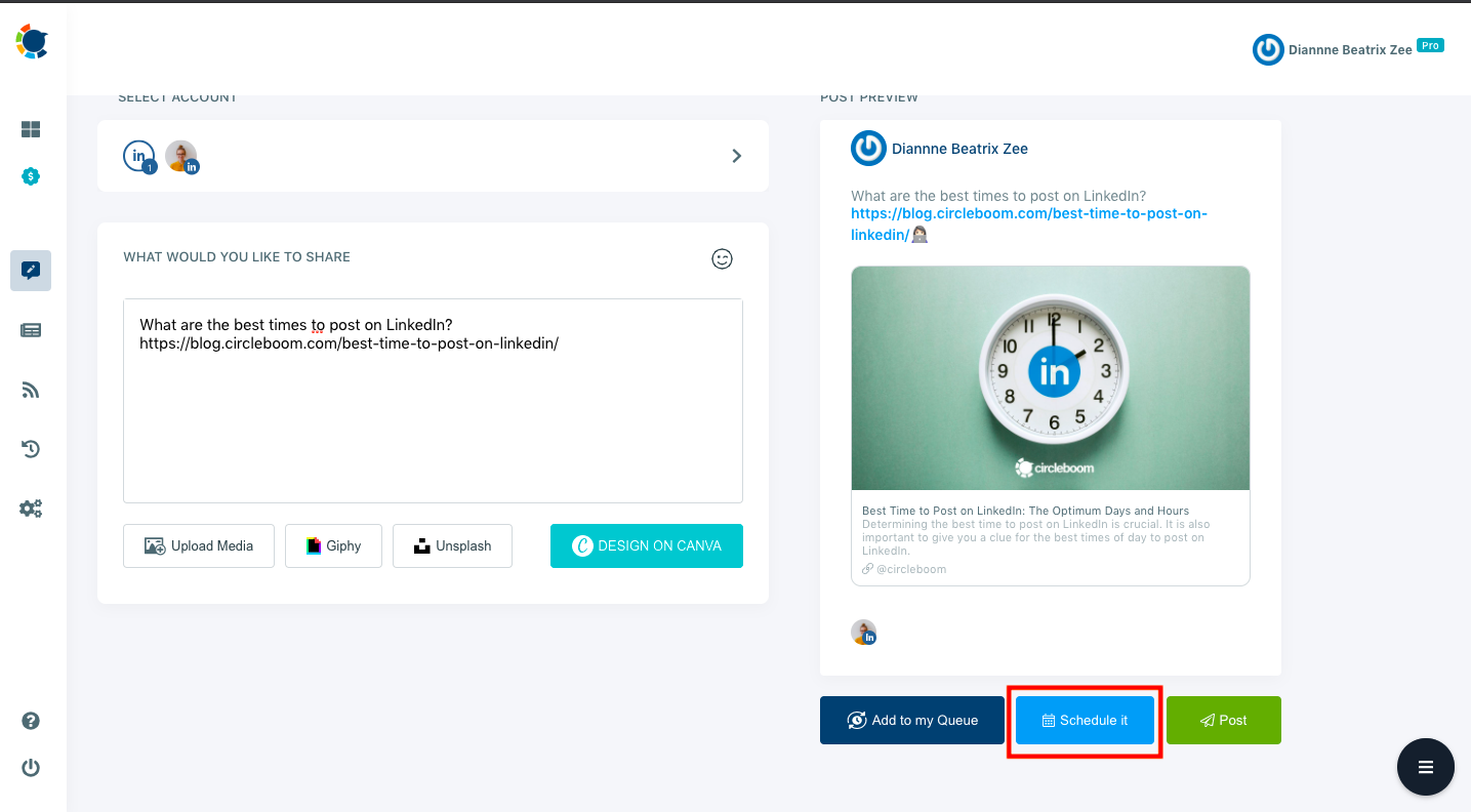 After your post is ready to go, locate the "Add to my Queue," "Schedule it," and "Post" options under the post preview.