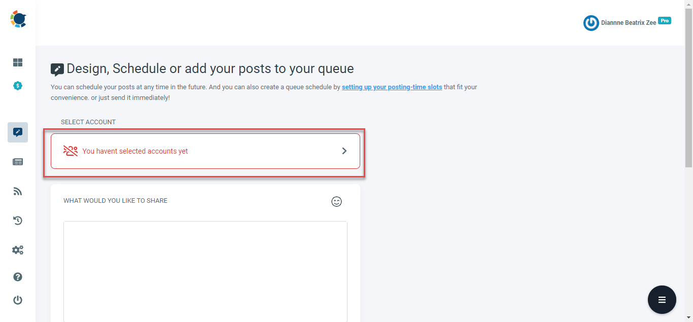 Step #5: On the post creation dashboard, first of all, select your LinkedIn account or LinkedIn Page that you want to schedule posts for.