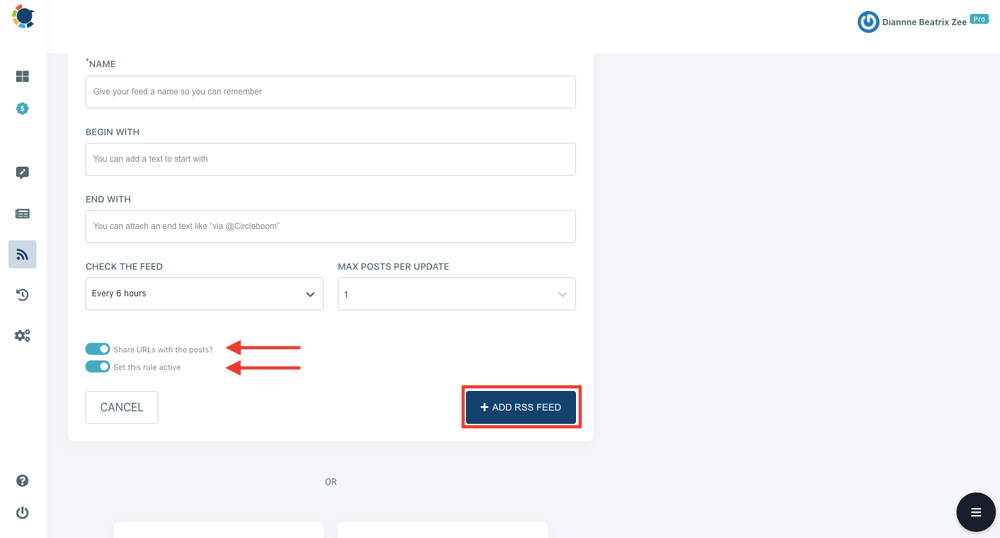 Step #6: Choose the LinkedIn account you wish to link RSS feeds, then type/paste the RSS feed URL. You may give your RSS feed a name to keep your dashboard organized.