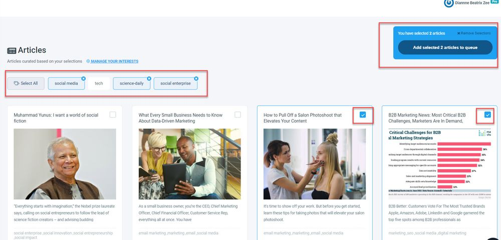 Step #4: Once you've chosen your interest areas, Circleboom will lead you to the article curation page.