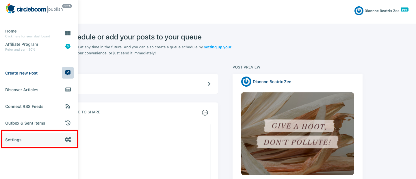 To arrange your post queue preferences, click "settings" on the right-hand menu.
