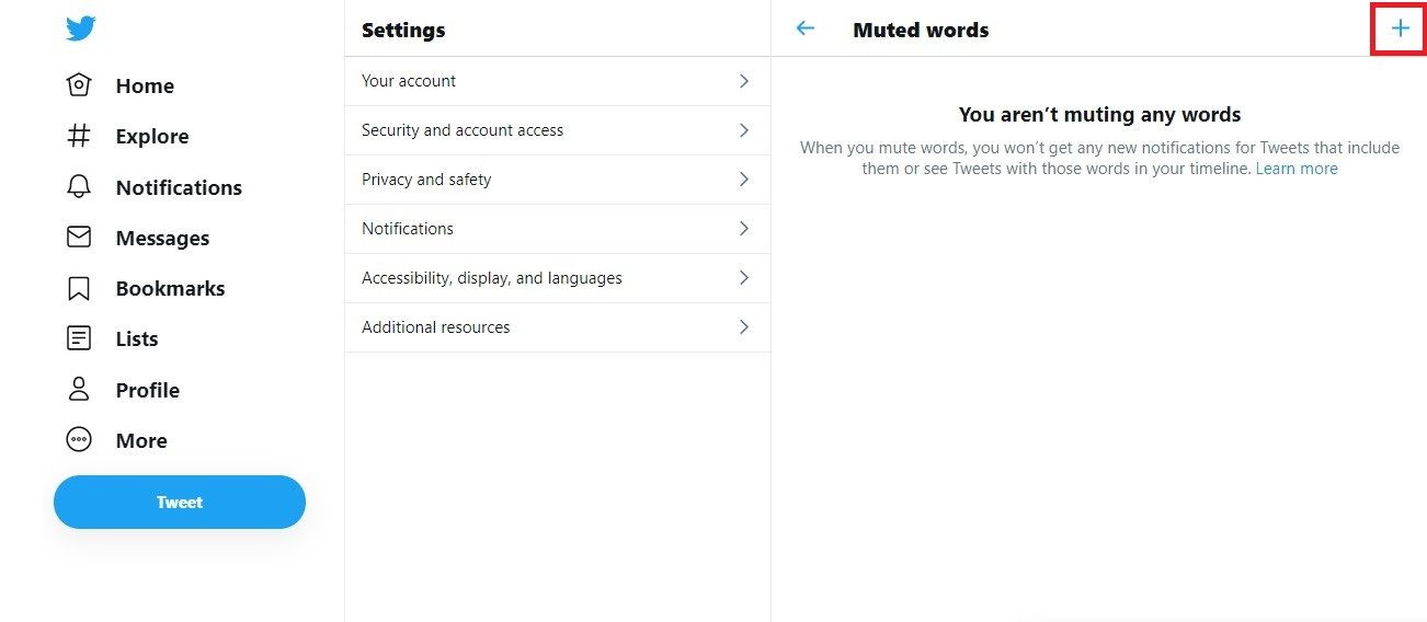 Step #5: From the opening menu, “Muted words” and tab “+.”