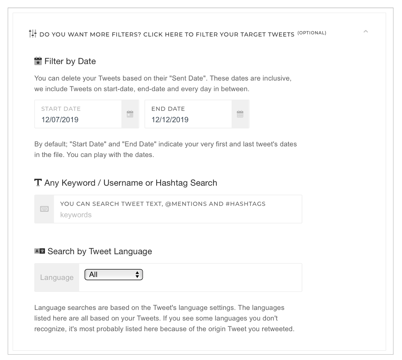 - If you want to check all of your Twitter archive, you can use Delete Your Twitter History Archive feature. You can filter them by date, keywords or username before deleting. And You can also prefer delete just retweets or replies.