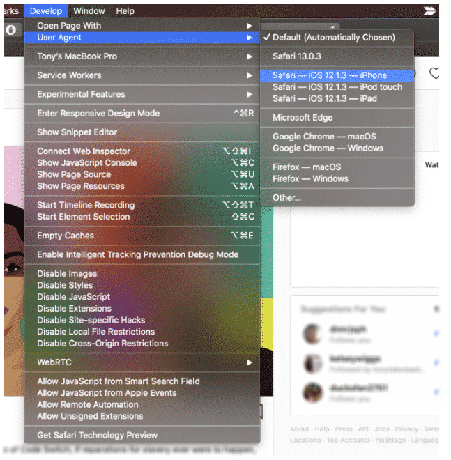 Step #2: Now, you should see the "Develop" menu at the top menu bar. Open this menu, and click "User Agent."