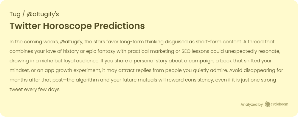 In the coming weeks, @altugify, the stars favor long-form thinking disguised as short-form content. A thread that combines your love of history or epic fantasy with practical marketing or SEO lessons could unexpectedly resonate, drawing in a niche but loyal audience. If you share a personal story about a campaign, a book that shifted your mindset, or an app growth experiment, it may attract replies from people you quietly admire. Avoid disappearing for months after that post, the algorithm and your future mutuals will reward consistency, even if it is just one strong tweet every few days.