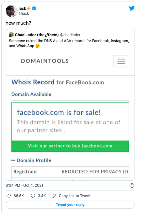 Dorsey jokingly showed his interest in purchasing the Facebook.com domain by retweeting a user's post claiming that someone had really placed the site up for sale.