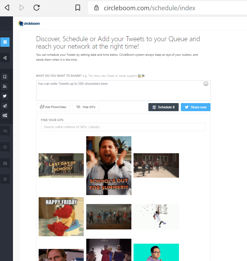 - Schedule videos/gifs/image/text/emoji posts to your social account. You can easily find any gif within the Circleboom publish tool itself while scheduling your posts.