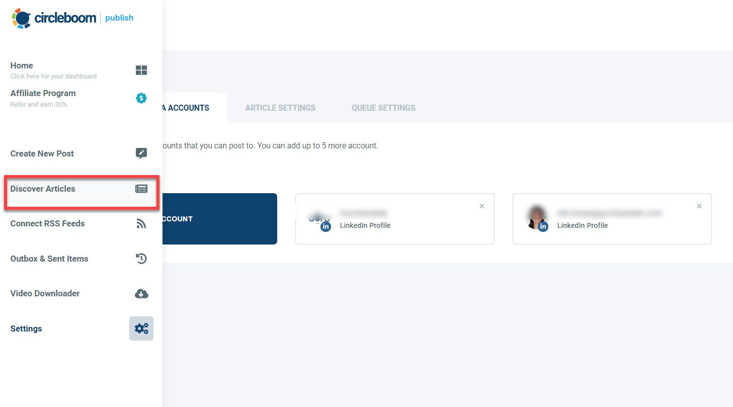 Step #5: You can use the “Discover Articles” option on the left-hand menu to find and queue articles to publish on LinkedIn.