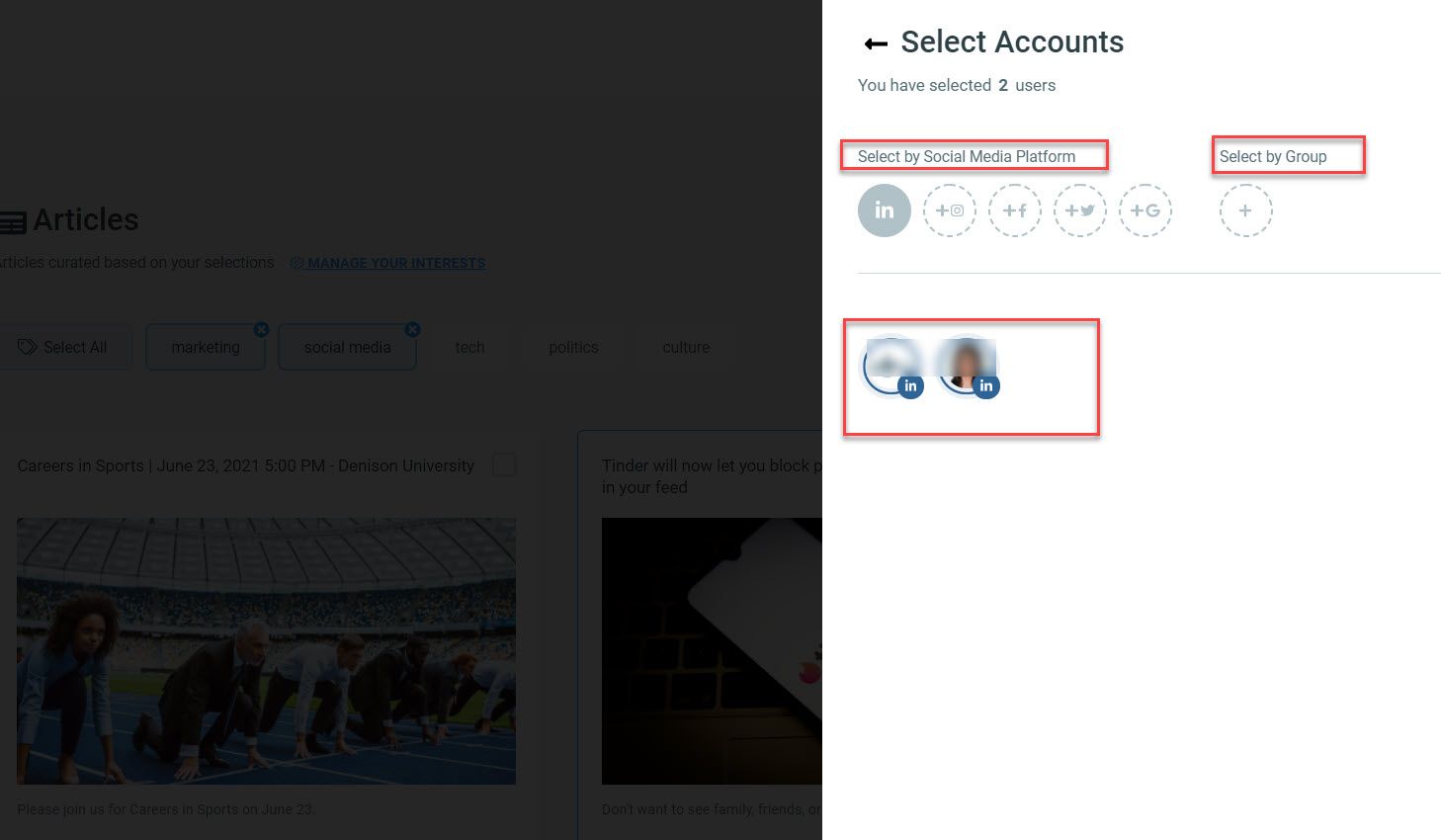 There is a “Select by Group” button, as you can see. You may use this to bring together your clients’ many LinkedIn profiles and manage them all in one spot!