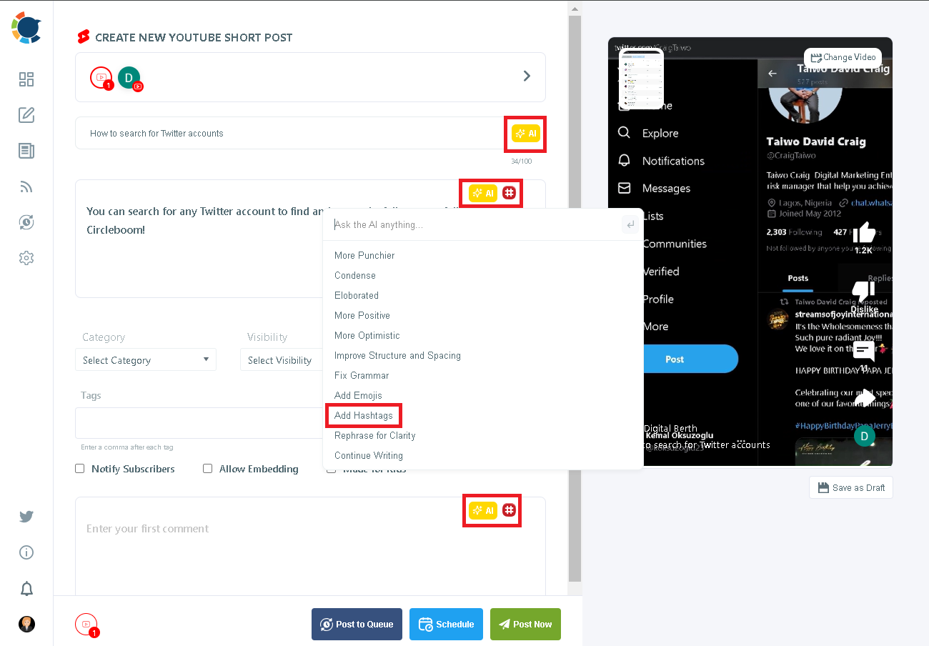 By strategically placing hashtags in both the title and description (and in first comments through Circleboom), conducting thorough research, and continuously monitoring performance, you can optimize your videos for maximum impact.