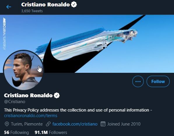 The only sportsman on the list, most followed Twitter accounts, is Portuguese soccer player Cristiano Ronaldo. Ronaldo among the most influential men on Twitter. His account is relatively steady with various content from his private life to his ongoing professional career on the Italian football team, Juventus.